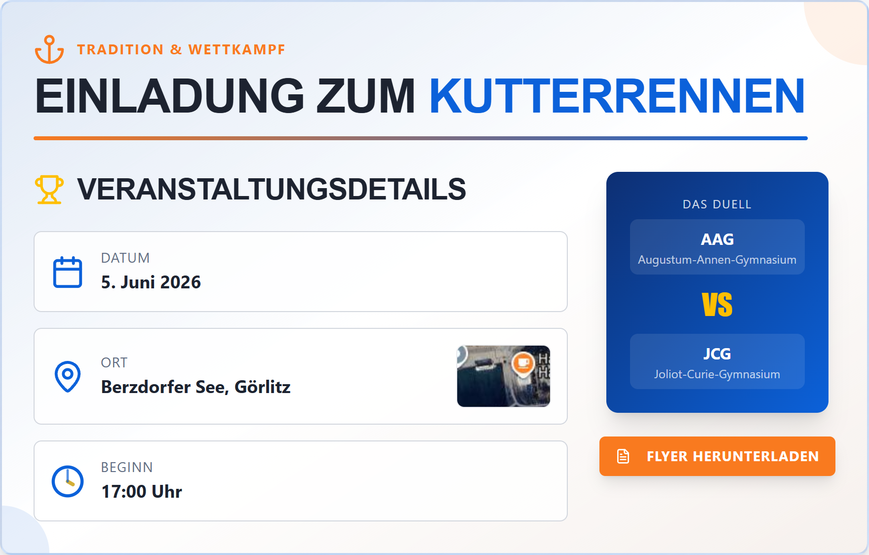 Wir freuen uns, Sie und Euch herzlich zum traditionellen Kutterrennen der Görlitzer Gymnasien einzuladen, das am 23. Mai 2025 im Hafen Tauchritz/Berzdorfer See stattfinden wird.